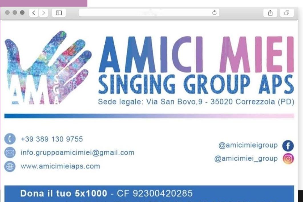Nella causale della donazione dovrà essere indicata la scritta: “Donazione Amici Miei Singing Group APS”.