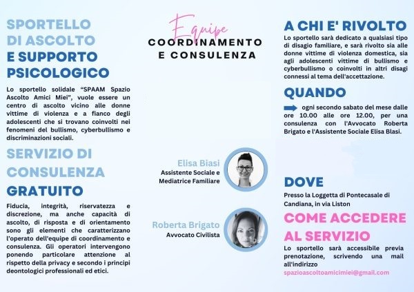 In un’ottica di presenza attiva nel nostro territorio, il 5 novembre 2022 nasce SPAAM (SPazio Ascolto Amici Miei), uno sportello gratuito rivolto ai giovani e alle donne vittime di qualsiasi tipo di violenza (bullismo, cyberbullismo, stalking, violenza psicologica, fisica,…) e/o con difficoltà economica e di inclusione sociale.